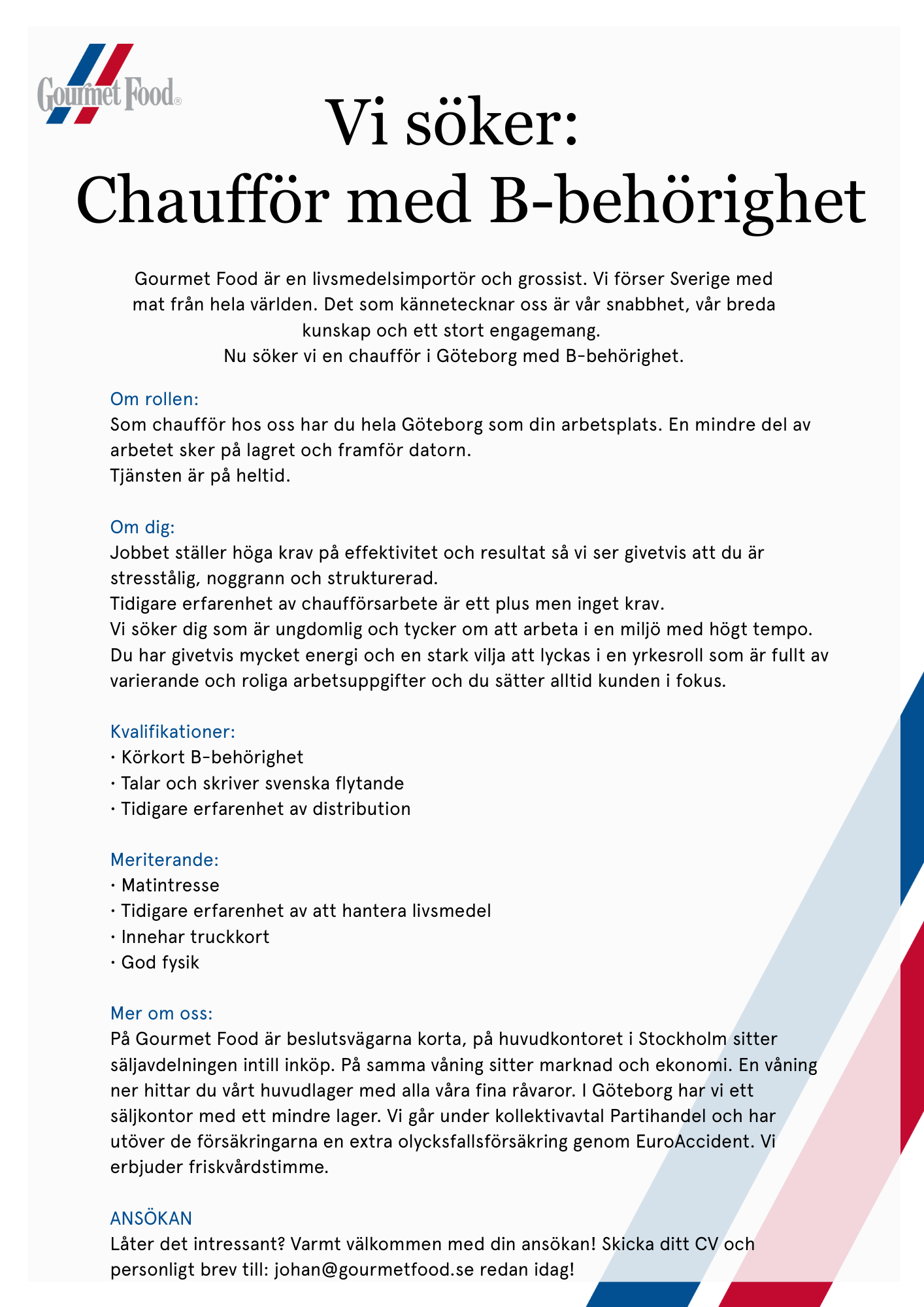 Lediga jobbVill du arbeta tillsammans med oss? Vad roligt att du är intresserad av att jobba med oss! Just nu söker vi chaufförer i både Stockholm och Göteborg. Chaufför med C-behörighet StockholmDownload Chaufför med B-behörighet GöteborgDownload